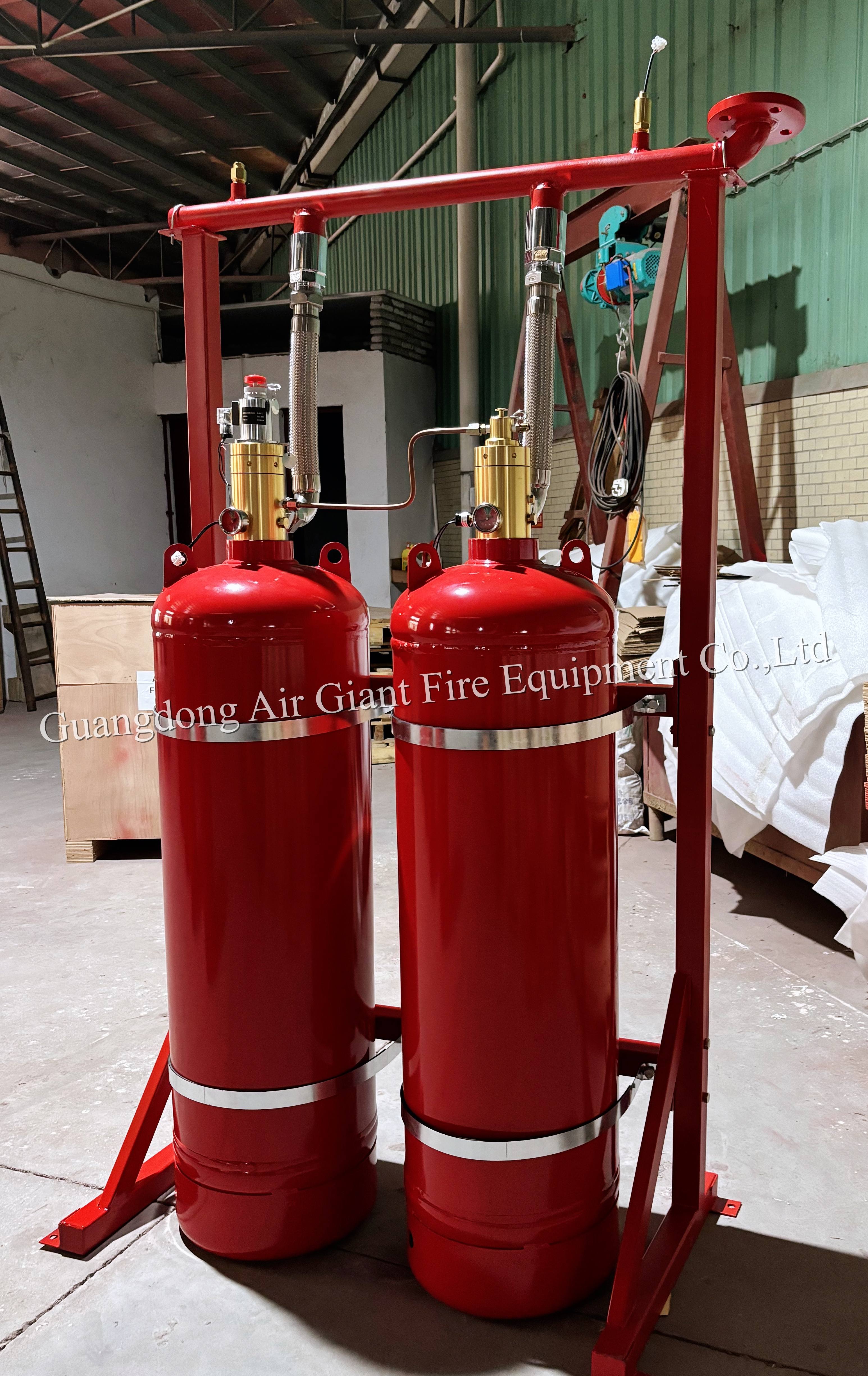 The main part of the system is fire fighting equipment. It is formed by several components: Novec1230 cylinders, a cylinder frame, nitrogen-pressure driving devices, a driving device frame, container valves, flexible hoses, liquid flow check valves, gas control pipes, gas flow check valves, manifolds, safety valves, selective valves, flanges, elbows and nozzles.