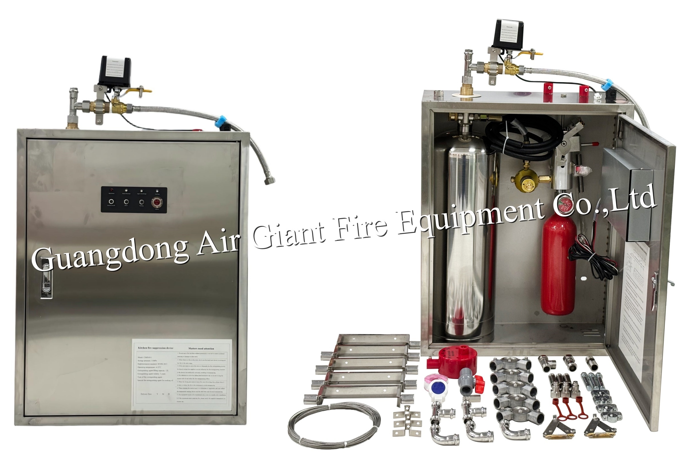 1.Thuốc xịt chữa cháy: Một khi cơ chế giải phóng được kích hoạt, các chất chữa cháy lỏng (như bọt, bột khô,hoặc các chất đặc biệt khác) được phun qua vòi phun trên bề mặt của thiết bị bếp, cũng như bên trong nắp ống xả, bộ lọc mỡ, và ống xả.Những chất đặc biệt này có thể nhanh chóng dập tắt ngọn lửa trong bình dầu và tạo thành một lớp phủ để ngăn chặn sự đốt cháy của hơi dầu, do đó ngăn chặn bốc cháy lại.